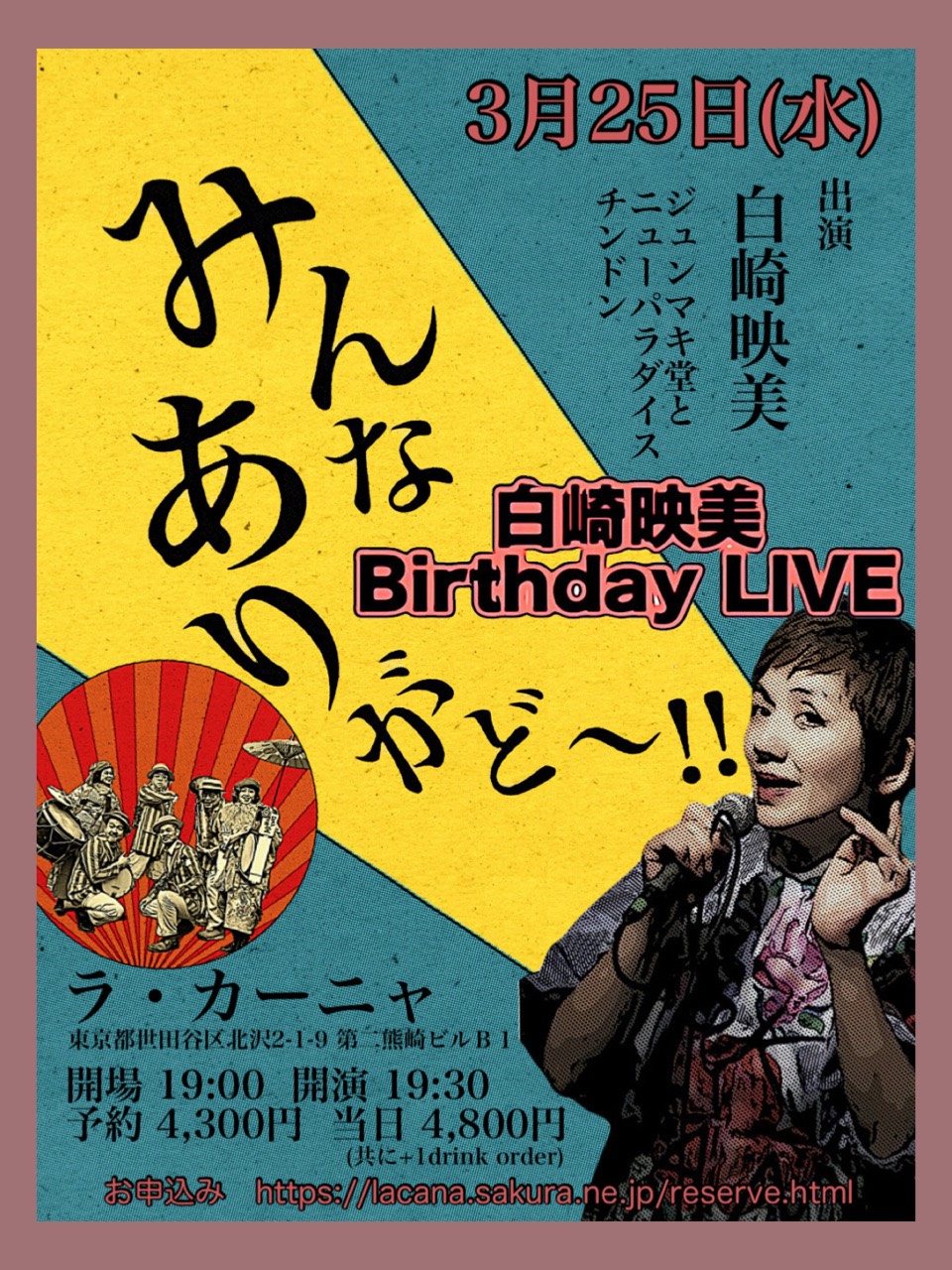 チケット:前売予約 4,000円 当日 4,500円(税込・ドリンク別途)
